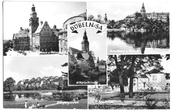 Ansichtskarte Döbeln Sa. fünf Abb. - Rathaus und Notenbank, Nikolaikirche, Schloßberg und Schule, Bürgergarten, Stadtbad Erhaltung I-II postalisch gelaufen, gestempelt: Leipzig BPA 32, 16.3.61 Druckvermerk: 1959 Herstellungsland: DDR Verlag: Erhard Neubert - A2378