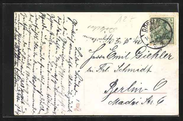 Personenbezogene Daten auf der Rückseite der Karte wurden durch blauen Textmarker unkenntlich gemacht. Die blauen Stellen sind auf die Vorderseite durchgeweicht und wirken sich negativ auf das Postkartenfoto aus