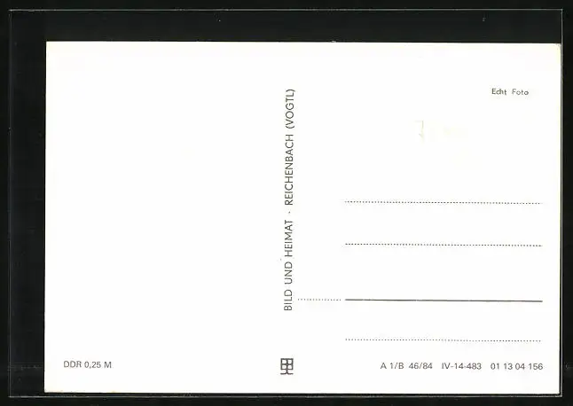 Personenbezogene Daten auf der Rückseite der Karte wurden durch blauen Textmarker unkenntlich gemacht. Die blauen Stellen sind auf die Vorderseite durchgeweicht und wirken sich negativ auf das Postkartenfoto aus