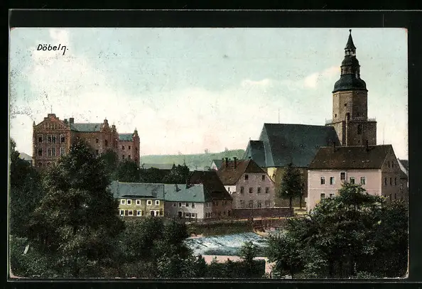 AK Döbeln i. Sa., Teilansicht mit Wehr und Nicolaikirche