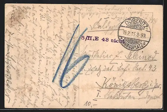 Personenbezogene Daten auf der Rückseite der Karte wurden durch blauen Textmarker unkenntlich gemacht. Die blauen Stellen sind auf die Vorderseite durchgeweicht und wirken sich negativ auf das Postkartenfoto aus