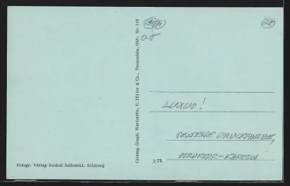 Personenbezogene Daten auf der Rückseite der Karte wurden durch blauen Textmarker unkenntlich gemacht. Die blauen Stellen sind auf die Vorderseite durchgeweicht und wirken sich negativ auf das Postkartenfoto aus