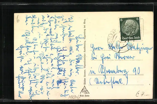 Personenbezogene Daten auf der Rückseite der Karte wurden durch blauen Textmarker unkenntlich gemacht. Die blauen Stellen sind auf die Vorderseite durchgeweicht und wirken sich negativ auf das Postkartenfoto aus