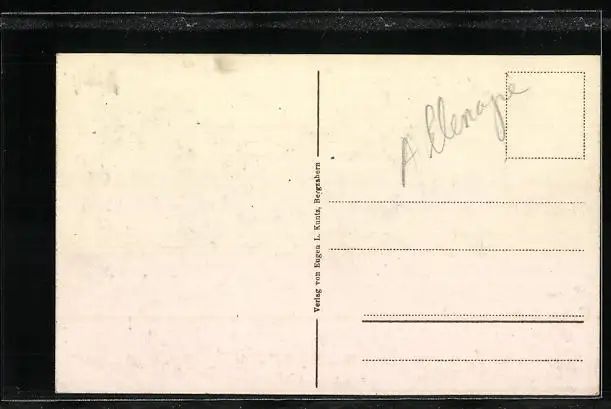 Personenbezogene Daten auf der Rückseite der Karte wurden durch blauen Textmarker unkenntlich gemacht. Die blauen Stellen sind auf die Vorderseite durchgeweicht und wirken sich negativ auf das Postkartenfoto aus