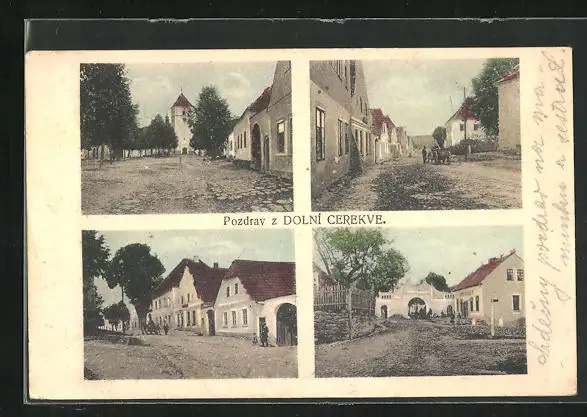 AK Dolni Cerekev, Strassenpartien mit Gebäudeansichten, Ortspartie mit Tor