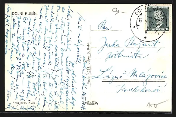 Personenbezogene Daten auf der Rückseite der Karte wurden durch blauen Textmarker unkenntlich gemacht. Die blauen Stellen sind auf die Vorderseite durchgeweicht und wirken sich negativ auf das Postkartenfoto aus