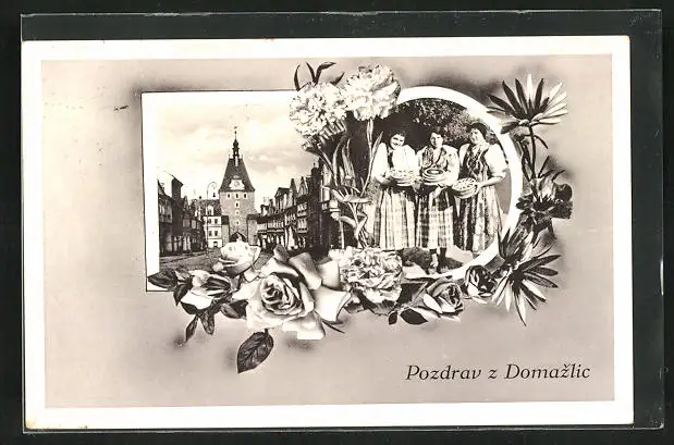 AK Domazlice, Marktplatz und Mädchen in Tracht