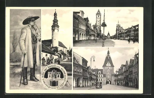 AK Domazlice, Strassenpartie mit Gebäudeansicht, Tor, Mann mit Tabakpfeife