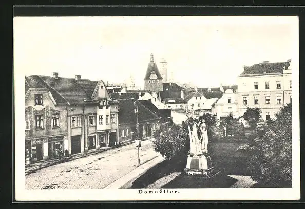 AK Domazlice, Strassenpartie mit Geschäften und Denkmal