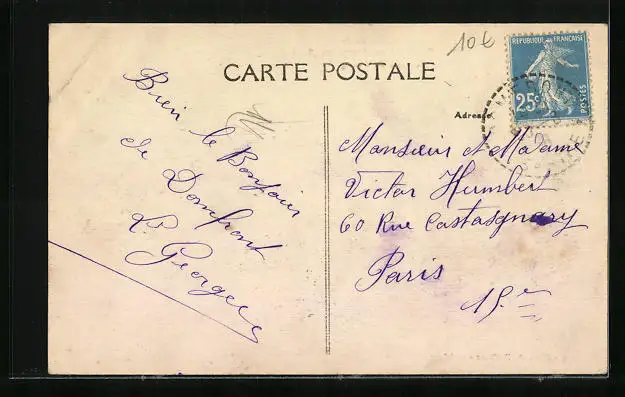 Personenbezogene Daten auf der Rückseite der Karte wurden durch blauen Textmarker unkenntlich gemacht. Die blauen Stellen sind auf die Vorderseite durchgeweicht und wirken sich negativ auf das Postkartenfoto aus