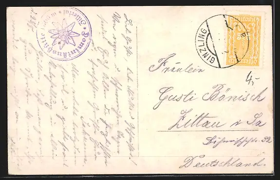 Personenbezogene Daten auf der Rückseite der Karte wurden durch blauen Textmarker unkenntlich gemacht. Die blauen Stellen sind auf die Vorderseite durchgeweicht und wirken sich negativ auf das Postkartenfoto aus