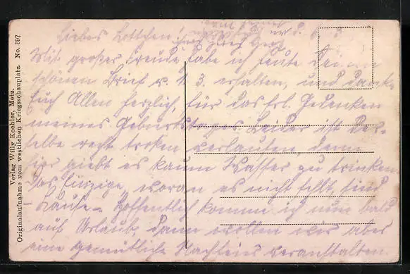 Personenbezogene Daten auf der Rückseite der Karte wurden durch blauen Textmarker unkenntlich gemacht. Die blauen Stellen sind auf die Vorderseite durchgeweicht und wirken sich negativ auf das Postkartenfoto aus