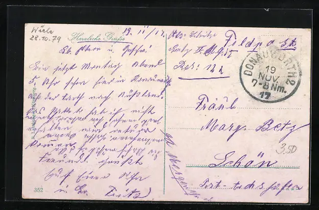 Personenbezogene Daten auf der Rückseite der Karte wurden durch blauen Textmarker unkenntlich gemacht. Die blauen Stellen sind auf die Vorderseite durchgeweicht und wirken sich negativ auf das Postkartenfoto aus