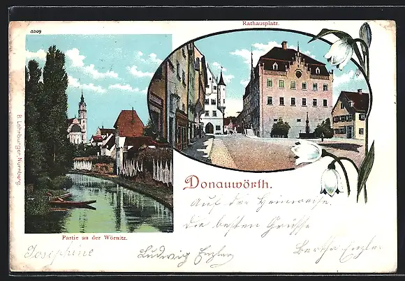 AK Donauwörth, Rathausplatz & Partie an der Wörnitz
