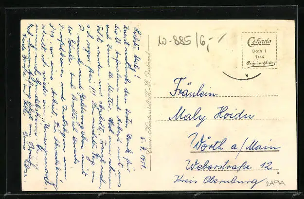 Personenbezogene Daten auf der Rückseite der Karte wurden durch blauen Textmarker unkenntlich gemacht. Die blauen Stellen sind auf die Vorderseite durchgeweicht und wirken sich negativ auf das Postkartenfoto aus