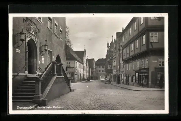 AK Donauwörth, Strassenpartie beim Rathaus mit Geschäften