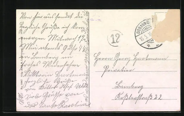 alte Ansichtskarte, gelaufen 1916, Briefmarke entfernt, rückseitig Oberflächenschaden, Stempelspur, guter Zustand