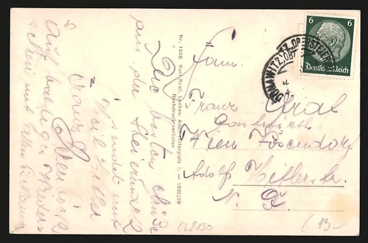 Personenbezogene Daten auf der Rückseite der Karte wurden durch blauen Textmarker unkenntlich gemacht. Die blauen Stellen sind auf die Vorderseite durchgeweicht und wirken sich negativ auf das Postkartenfoto aus