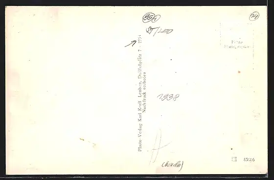 Personenbezogene Daten auf der Rückseite der Karte wurden durch blauen Textmarker unkenntlich gemacht. Die blauen Stellen sind auf die Vorderseite durchgeweicht und wirken sich negativ auf das Postkartenfoto aus