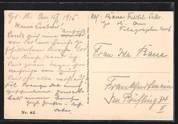 Personenbezogene Daten auf der Rückseite der Karte wurden durch blauen Textmarker unkenntlich gemacht. Die blauen Stellen sind auf die Vorderseite durchgeweicht und wirken sich negativ auf das Postkartenfoto aus