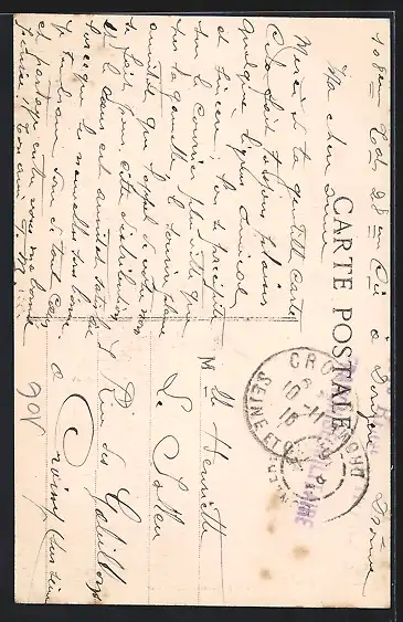 Personenbezogene Daten auf der Rückseite der Karte wurden durch blauen Textmarker unkenntlich gemacht. Die blauen Stellen sind auf die Vorderseite durchgeweicht und wirken sich negativ auf das Postkartenfoto aus