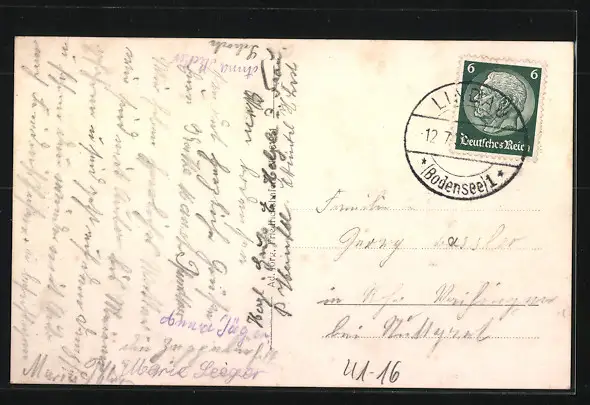 Personenbezogene Daten auf der Rückseite der Karte wurden durch blauen Textmarker unkenntlich gemacht. Die blauen Stellen sind auf die Vorderseite durchgeweicht und wirken sich negativ auf das Postkartenfoto aus