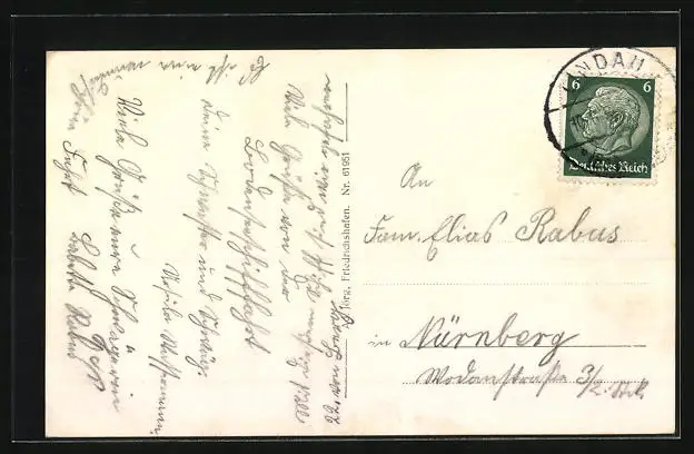 Personenbezogene Daten auf der Rückseite der Karte wurden durch blauen Textmarker unkenntlich gemacht. Die blauen Stellen sind auf die Vorderseite durchgeweicht und wirken sich negativ auf das Postkartenfoto aus