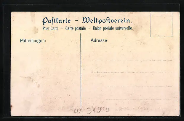 Personenbezogene Daten auf der Rückseite der Karte wurden durch blauen Textmarker unkenntlich gemacht. Die blauen Stellen sind auf die Vorderseite durchgeweicht und wirken sich negativ auf das Postkartenfoto aus