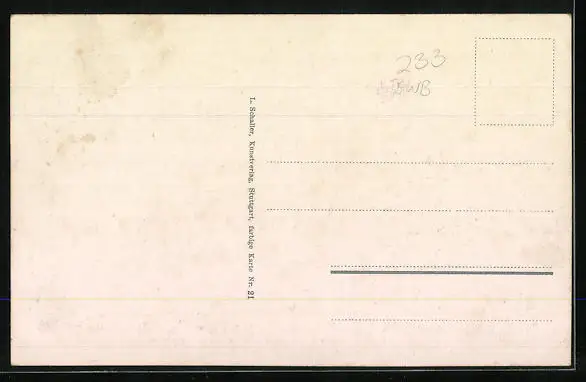 Personenbezogene Daten auf der Rückseite der Karte wurden durch blauen Textmarker unkenntlich gemacht. Die blauen Stellen sind auf die Vorderseite durchgeweicht und wirken sich negativ auf das Postkartenfoto aus