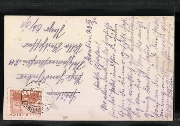 Personenbezogene Daten auf der Rückseite der Karte wurden durch blauen Textmarker unkenntlich gemacht. Die blauen Stellen sind auf die Vorderseite durchgeweicht und wirken sich negativ auf das Postkartenfoto aus