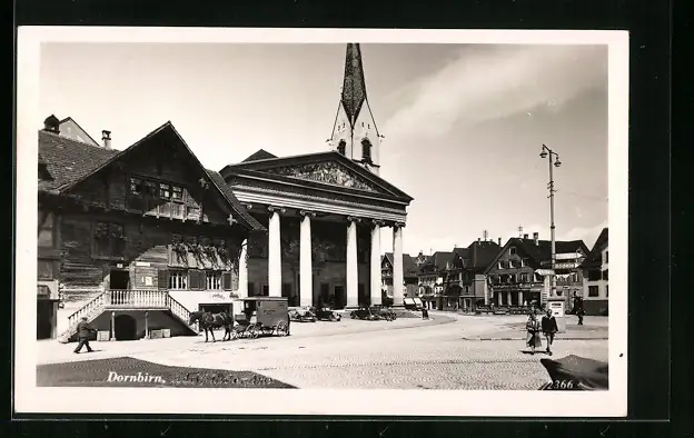 AK Dornbirn, Marktplatz mit Autos und Kutsche