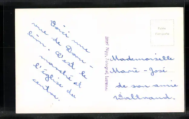 Personenbezogene Daten auf der Rückseite der Karte wurden durch blauen Textmarker unkenntlich gemacht. Die blauen Stellen sind auf die Vorderseite durchgeweicht und wirken sich negativ auf das Postkartenfoto aus