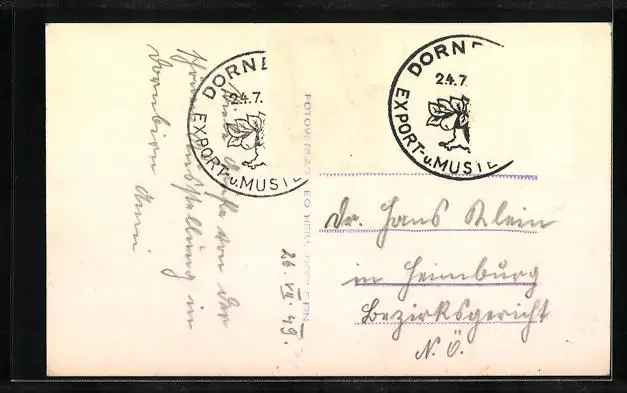 Personenbezogene Daten auf der Rückseite der Karte wurden durch blauen Textmarker unkenntlich gemacht. Die blauen Stellen sind auf die Vorderseite durchgeweicht und wirken sich negativ auf das Postkartenfoto aus