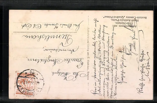 Personenbezogene Daten auf der Rückseite der Karte wurden durch blauen Textmarker unkenntlich gemacht. Die blauen Stellen sind auf die Vorderseite durchgeweicht und wirken sich negativ auf das Postkartenfoto aus