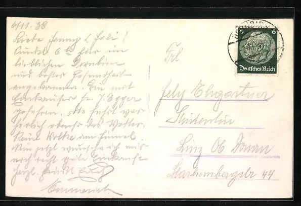 Personenbezogene Daten auf der Rückseite der Karte wurden durch blauen Textmarker unkenntlich gemacht. Die blauen Stellen sind auf die Vorderseite durchgeweicht und wirken sich negativ auf das Postkartenfoto aus
