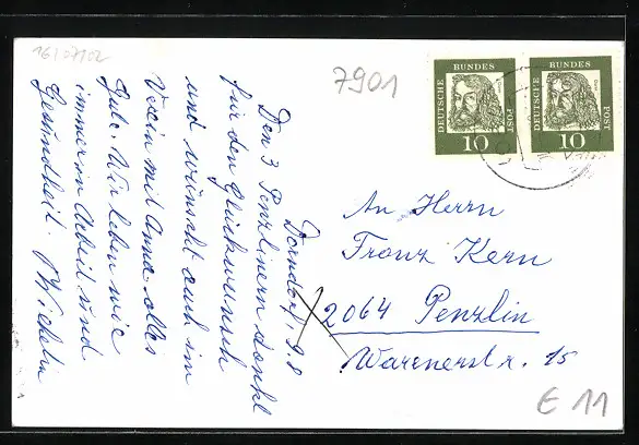Personenbezogene Daten auf der Rückseite der Karte wurden durch blauen Textmarker unkenntlich gemacht. Die blauen Stellen sind auf die Vorderseite durchgeweicht und wirken sich negativ auf das Postkartenfoto aus