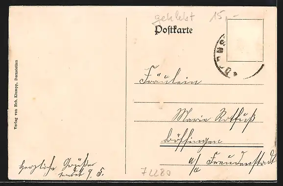 Personenbezogene Daten auf der Rückseite der Karte wurden durch blauen Textmarker unkenntlich gemacht. Die blauen Stellen sind auf die Vorderseite durchgeweicht und wirken sich negativ auf das Postkartenfoto aus