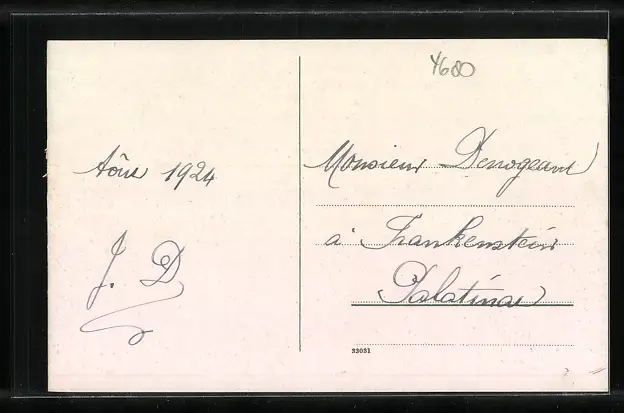 Personenbezogene Daten auf der Rückseite der Karte wurden durch blauen Textmarker unkenntlich gemacht. Die blauen Stellen sind auf die Vorderseite durchgeweicht und wirken sich negativ auf das Postkartenfoto aus