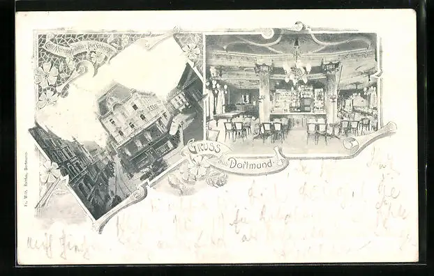 AK Dortmund, Cafe Metropol aus der Vogelschau und Innenansicht