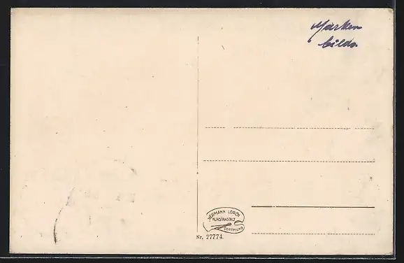 Personenbezogene Daten auf der Rückseite der Karte wurden durch blauen Textmarker unkenntlich gemacht. Die blauen Stellen sind auf die Vorderseite durchgeweicht und wirken sich negativ auf das Postkartenfoto aus