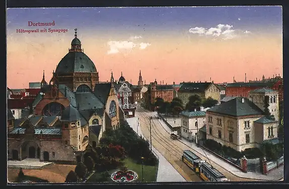 AK Dortmund, Hiltropwall mit Synagoge, Strassenbahn