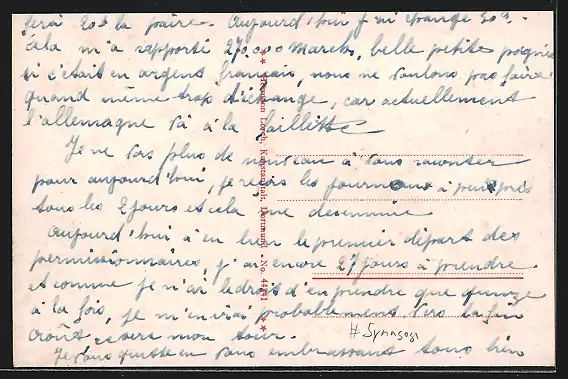 Personenbezogene Daten auf der Rückseite der Karte wurden durch blauen Textmarker unkenntlich gemacht. Die blauen Stellen sind auf die Vorderseite durchgeweicht und wirken sich negativ auf das Postkartenfoto aus