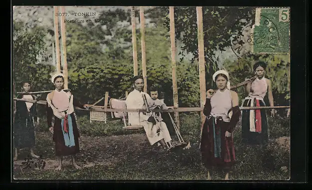 AK Doson, Porteurs en Marche, Mann in der Senfte mit seinen Trägern