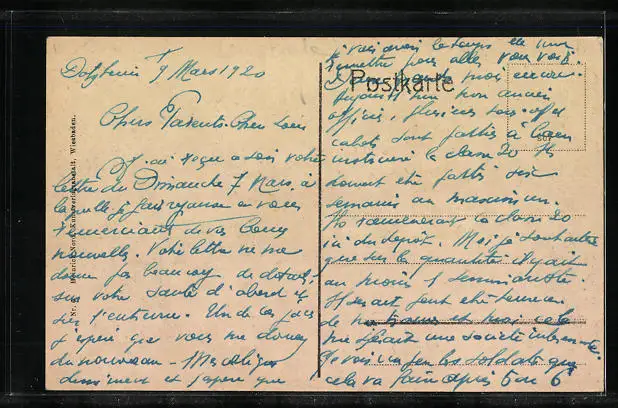 Personenbezogene Daten auf der Rückseite der Karte wurden durch blauen Textmarker unkenntlich gemacht. Die blauen Stellen sind auf die Vorderseite durchgeweicht und wirken sich negativ auf das Postkartenfoto aus