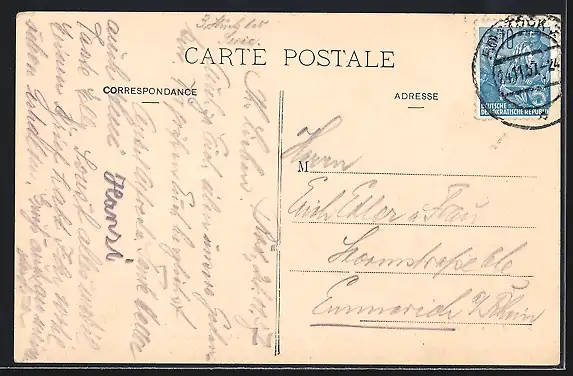Personenbezogene Daten auf der Rückseite der Karte wurden durch blauen Textmarker unkenntlich gemacht. Die blauen Stellen sind auf die Vorderseite durchgeweicht und wirken sich negativ auf das Postkartenfoto aus
