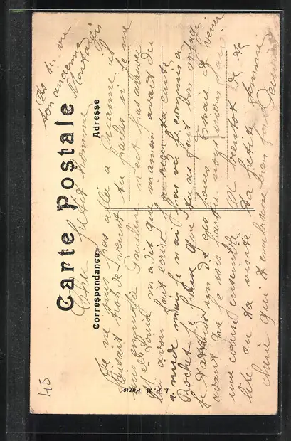 Personenbezogene Daten auf der Rückseite der Karte wurden durch blauen Textmarker unkenntlich gemacht. Die blauen Stellen sind auf die Vorderseite durchgeweicht und wirken sich negativ auf das Postkartenfoto aus