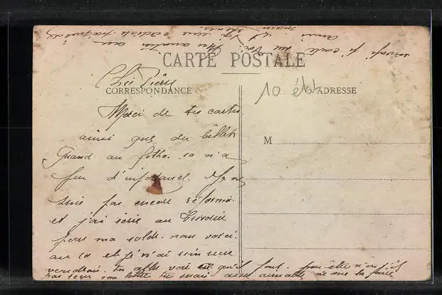 Personenbezogene Daten auf der Rückseite der Karte wurden durch blauen Textmarker unkenntlich gemacht. Die blauen Stellen sind auf die Vorderseite durchgeweicht und wirken sich negativ auf das Postkartenfoto aus