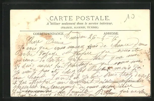 Personenbezogene Daten auf der Rückseite der Karte wurden durch blauen Textmarker unkenntlich gemacht. Die blauen Stellen sind auf die Vorderseite durchgeweicht und wirken sich negativ auf das Postkartenfoto aus