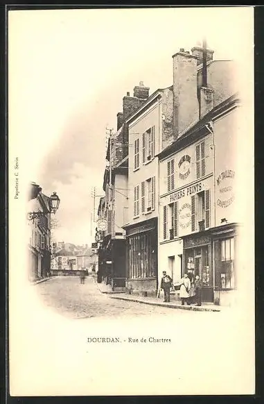 AK Dourdan, Rue de Chartres, Magasin Papiers et peints