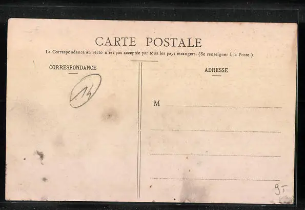 Personenbezogene Daten auf der Rückseite der Karte wurden durch blauen Textmarker unkenntlich gemacht. Die blauen Stellen sind auf die Vorderseite durchgeweicht und wirken sich negativ auf das Postkartenfoto aus